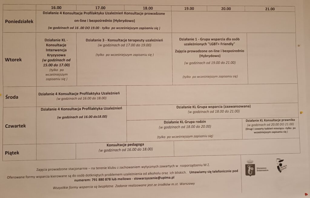 Sierpień to miesiąc trzeźwości, więc przypominamy, że na Siennej 45/1 gdzie działa nasze Stowarzyszenie, jest też wiele innych dyżurów i konsultacji.